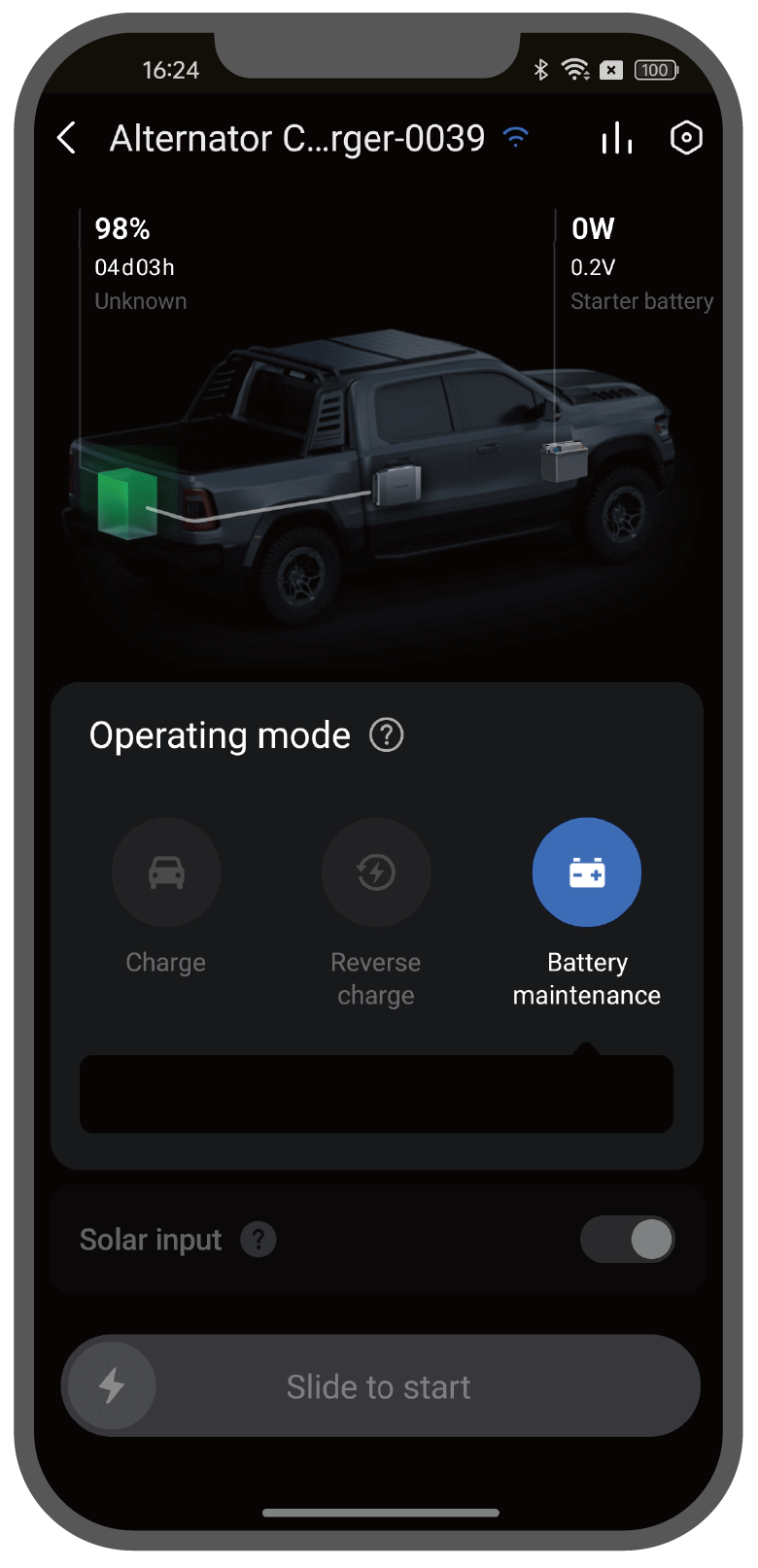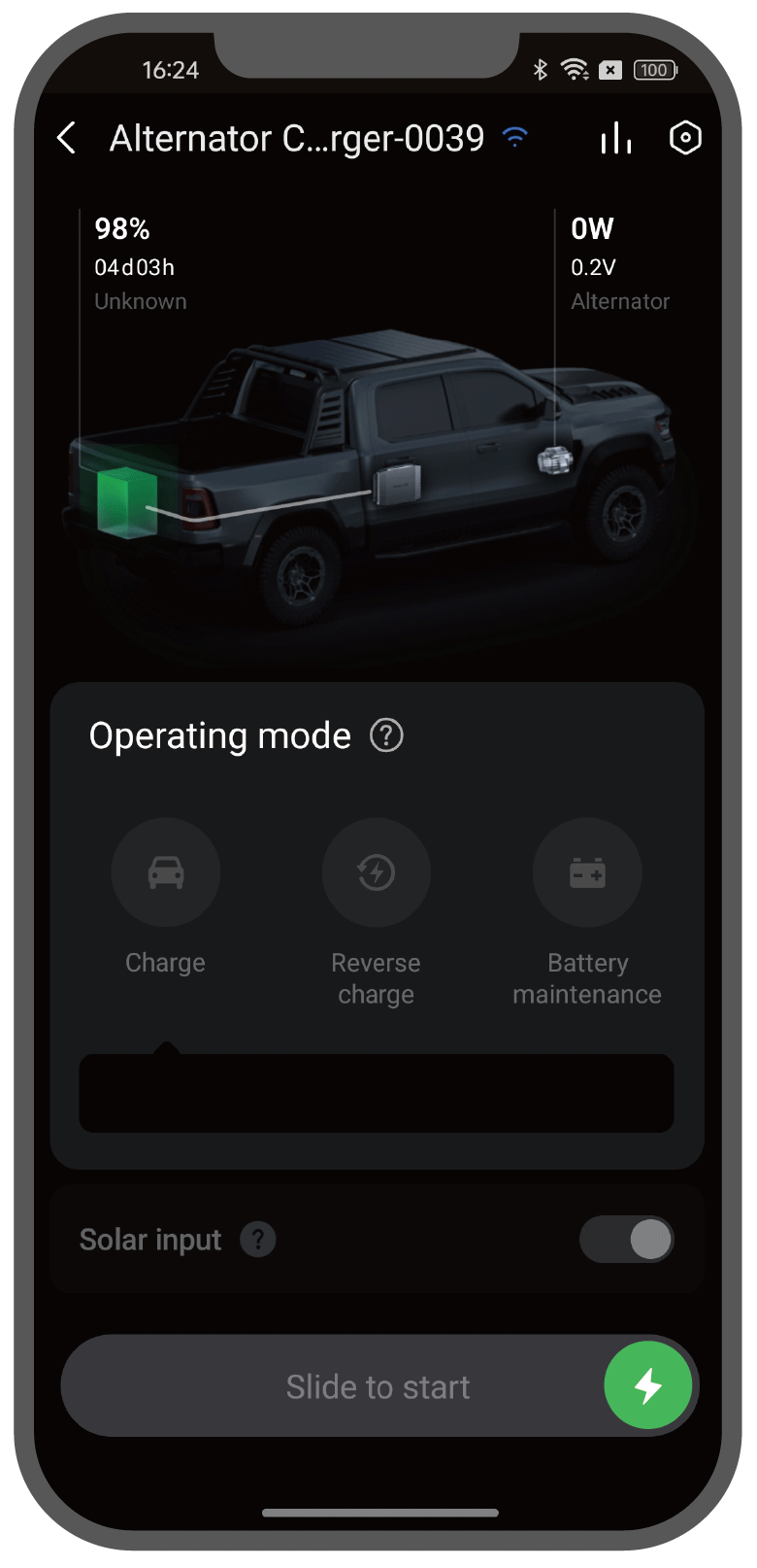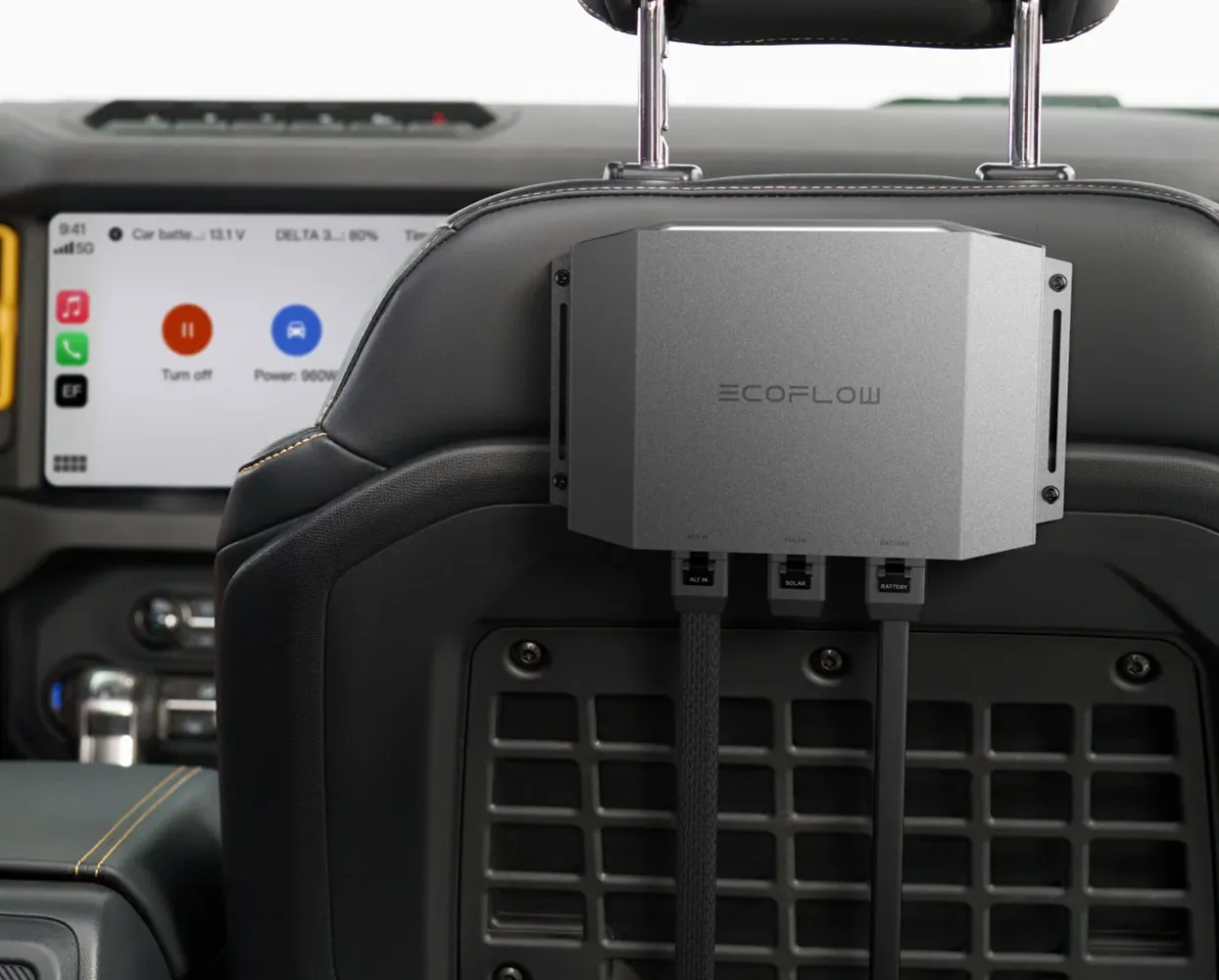 The Alternator Charger requires connection to the EcoFlow app to enable operation and select working modes. It is available on iOS and Android, and supports CarPlay and Android Auto.